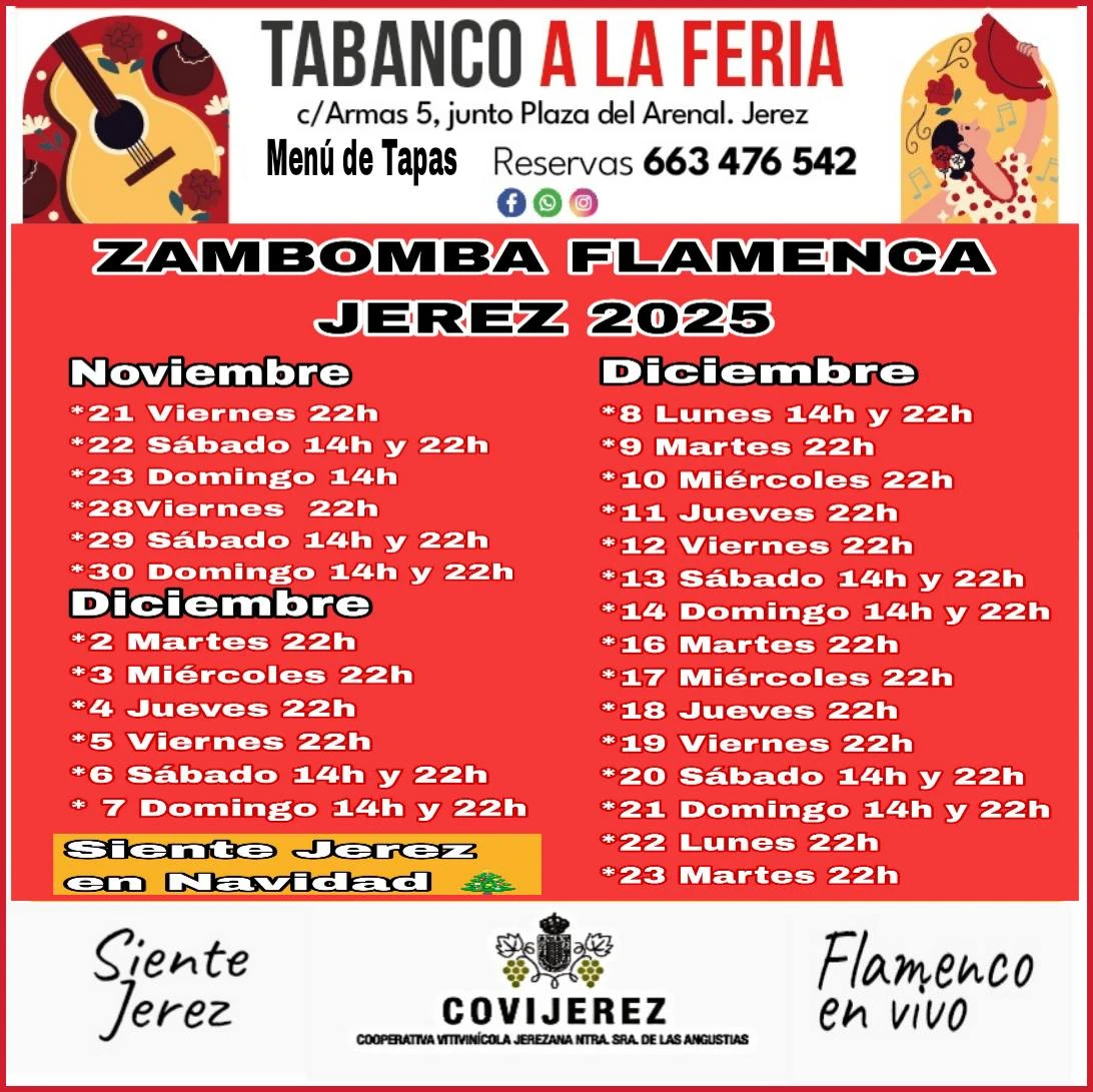 Las zambombas jerezanas, declaradas Bien de Interés Cultural, son mucho más que un concierto; son una celebración comunitaria donde el cante, el baile y la gastronomía se fusionan para crear un ambiente festivo único e irrepetible. Con el ritmo de la zambomba, el pandero y la botella de anís, se entonan villancicos flamencos y se comparte la alegría propia de estas fechas tan señaladas. ‘Tabanco a la Feria Zambombas’ es una propuesta que honra esta tradición, ofreciendo a los asistentes una experiencia inmersiva en la cultura y el arte de vivir andaluz.